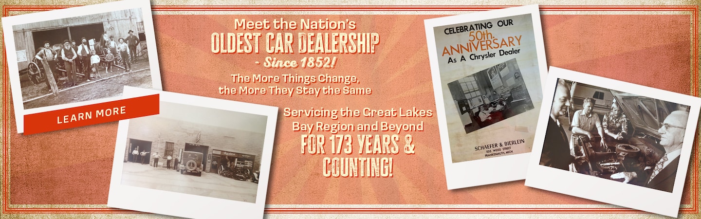 Welcome to Schaefer & Bierlein... the oldest car dealership in the United States! Established in 1852, now celebrating 173 years of service. Here at Schaefer & Bierlein Chrysler Dodge Jeep Ram FIAT, it is our mission to be the automotive home of drivers in the Frankenmuth, MI area. We provide a vast selection of new and used vehicles, exceptional car care and customer service with a smile! Come work with the best! Schaefer & Bierlein is the area's FIRST Chrysler Dodge Jeep Ram dealership. Save your Time & Money by making Schaefer & Bierlein your FIRST choice when it comes to making a decision where you Service and Purchase your vehicles. Schaefer & Bierlein...Where Service Sells Cars & MORE!Why Choose Schaefer & Bierlein? Schaefer & Bierlein offers MORE! And Experience Counts!