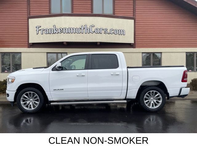 To get your free CARFAX vehicle history report click here: www.frankenmuthcars.net, ** Apple CarPlay/Android Auto, ** Backup Camera, ** Bluetooth, Hands Free, ** Cooled Seats, ** Cruise Control, ** Heated Seats, ** Heated Steering Wheel, ** Keyless Entry, ** Keyless Start, ** Leather Seats, ** Remote Start, ** Satellite Radio, ** Steering Wheel Controls, ** Tow Hitch / Trailer Hitch, 4D Crew Cab, HEMI 5.7L V8 Multi Displacement VVT eTorque, 4WD, 12" Touchscreen Display, 2nd Row In Floor Storage Bins, 3.92 Rear Axle Ratio, 4G LTE Wi-Fi Hot Spot, Alloy wheels, Apple CarPlay, Auto High Beam Headlamp Control, Bed Utility Group, Black Interior Accents, Blind Spot & Cross Path Detection, Body Color Exterior Mirrors, Body Color Front Bumper, Body Color Premium Power Mirrors, Body Color Rear Bumper w/Step Pads, Connected Travel & Traffic Services, Connectivity - US/Canada, Disassociated Touchscreen Display, Electric Shift-On-Demand Transfer Case, Foam Bottle Insert (Door Trim Panel), For Details, Visit DriveUconnect.com, For More Info, Call 800-643-2112, Front Door Accent Lighting, Front LED Fog Lamps, Global Telematics Box Module (TBM), Google Android Auto, GPS Antenna Input, GPS Navigation, Grille Surround 3 Body Color Tex 2 Black, harman/kardon 19 Speaker Premium Sound, HD Radio, Heated Front Seats, Integrated Center Stack Radio, Integrated Voice Command w/Bluetooth, Laramie Level B Equipment Group, LED Reflector Headlamps, MOPAR 4 Adjustable Cargo Tie-Down Hooks, MOPAR Spray In Bedliner, Navigation System, ParkSense Front/Rear Park Assist w/Stop, Pick-Up Box Lighting, Quick Order Package 27H Laramie, Radio: Uconnect 5 Nav w/12.0" Display, Rain Sensitive Windshield Wipers, RAM Grille Badge - Chrome, Rear Door Accent Lighting, Rear Power Sliding Window, Rear Underseat Compartment Storage, Rear Window Defroster, Remote Tailgate Release, SiriusXM Radio Service, SiriusXM w/360L, Sport Appearance Package, Sport Decal, Sport Performance Hood, USB Host Flip, Ventilated Front Seats, Wheels: 20" x 9" Premium Painted w/Inserts.